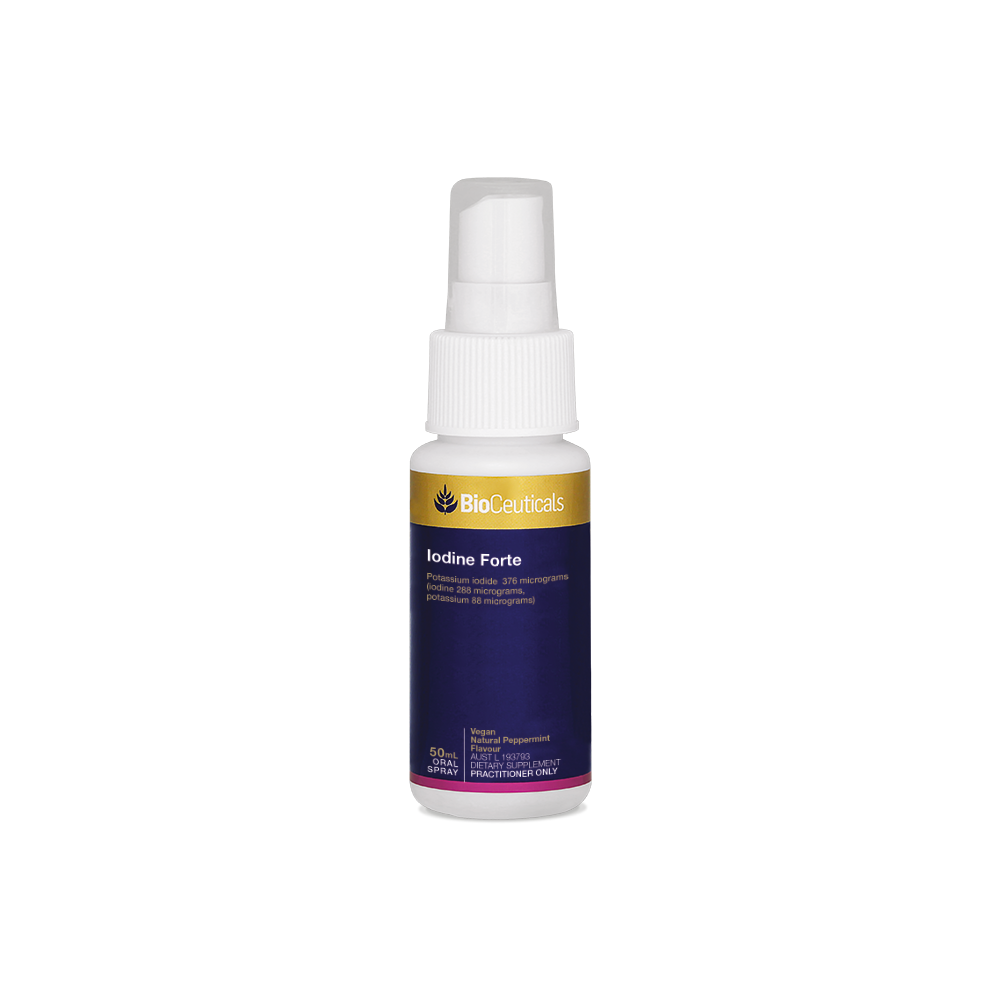 Iodine Forte is a refreshing peppermint flavoured oral spray that supports healthy thyroid gland function and healthy thyroid hormones. It helps to maintain iodine levels in the body and aids thyroid hormone production.