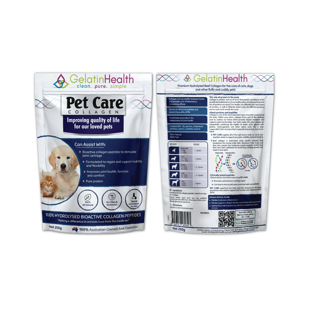 In Elderly Animals it increases activity, helps improve mobility and flexibility and elevates the quality of life by helping to reduce inflammation and discomfort in the joints. In Active Animals it supports mobility and flexibility, optimises joint health and function. Pet Care Collagen is the perfect natural treatment or supplement to their diet. Pet Care has excellent solubility so just sprinkle over food.