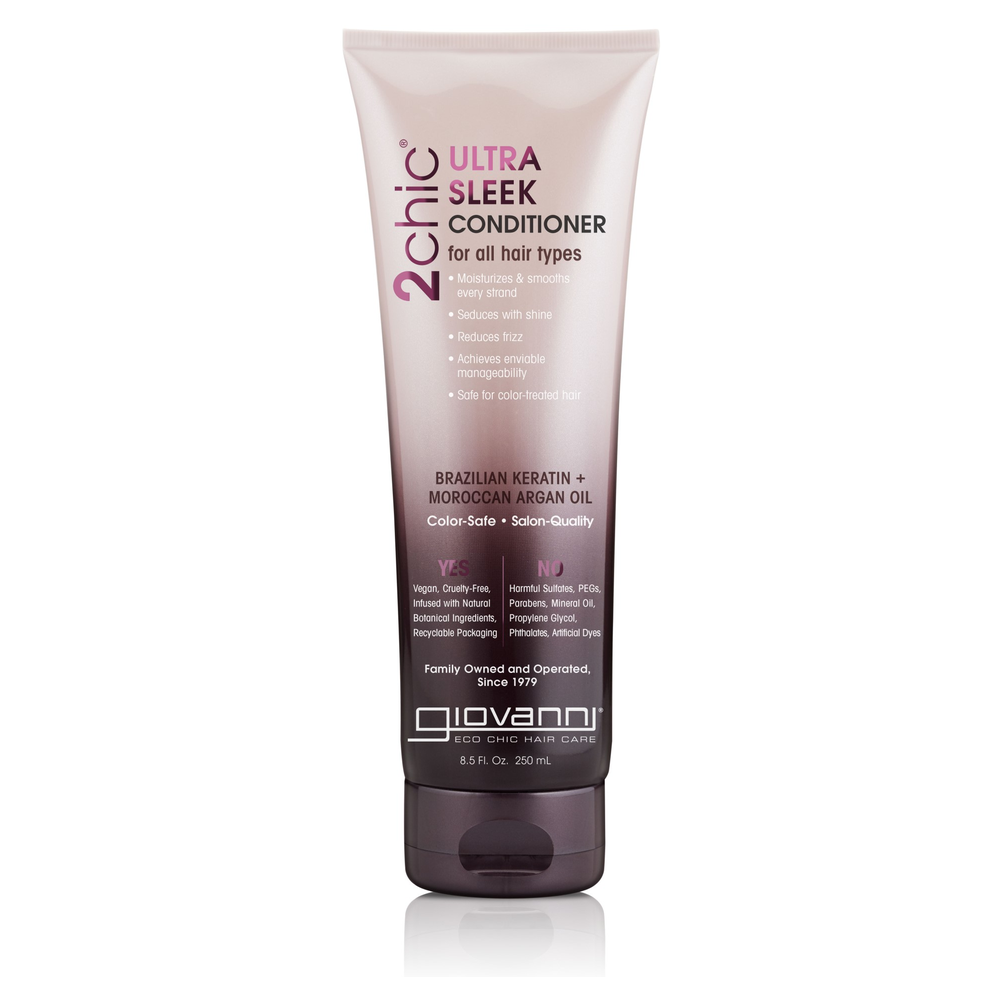 How to be 2chic®: Take a trip. After washing with 2chic® Brazilian Keratin & Moroccan Argan Oil Ultra-Sleek Shampoo, massage Giovanni Ultra-Sleek conditioner into wet hair from roots to ends. Rinse. Delight in magnificently smooth and shiny hair. For style that lasts, finish with our Ultra-Sleek soft hold gel or styling wax.