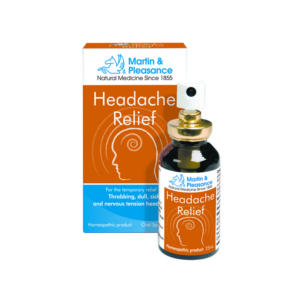 Martin & Pleasance proudly prepare our natural remedies using traditional methods in our own laboratory.These lactose free sprays can be used by everyone, including pregnant and breastfeeding women, babies, children and people currently on other medications.Headache Relief is a homeopathic formulation combined with Schuessler Tissue Salts traditionally used for the relief of headaches and the associated symptoms such as throbbing, plus dull, sick and nervous tension headaches.