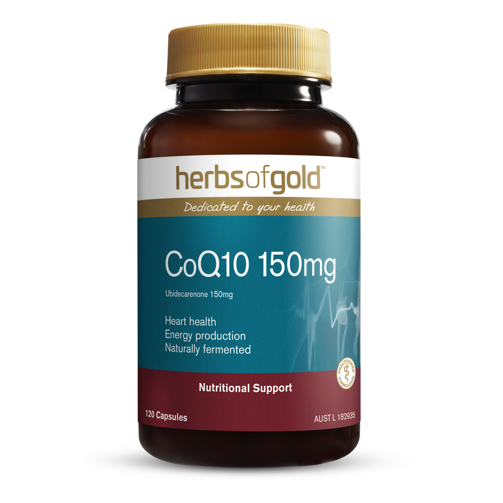 Herbs of Gold CoQ10 150mg contains naturally fermented coenzyme Q10 in a soy-free rice bran oil base.
