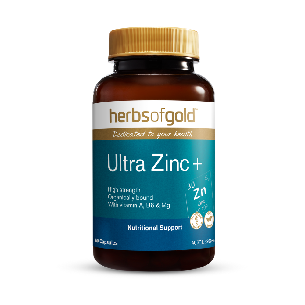 Herbs of Gold Ultra Zinc + contains high-strength zinc that is organically bound to support absorption, with cofactors vitamin A, B6 and magnesium.