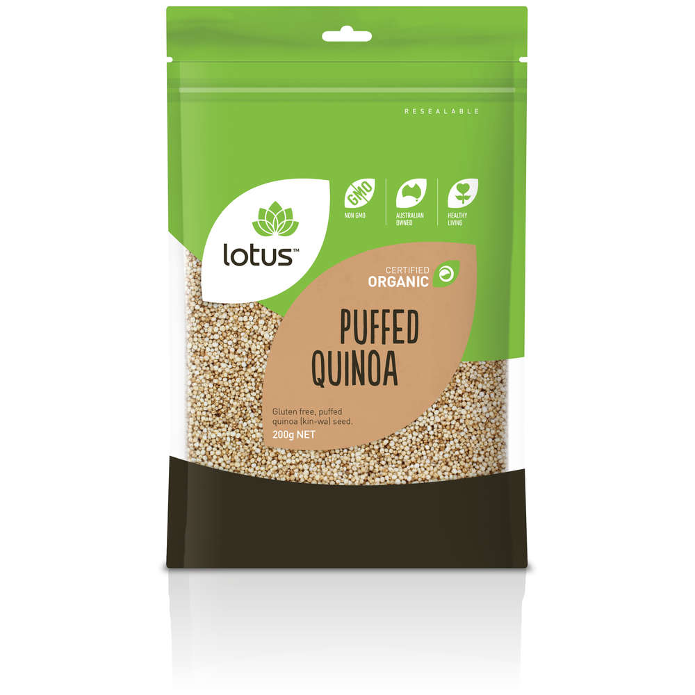 - Lotus Organic Puffed Quinoa is sourced from Germany and packed in Australia. It comes in a 200gm re-sealable oxygen barrier bag to preserve freshness.