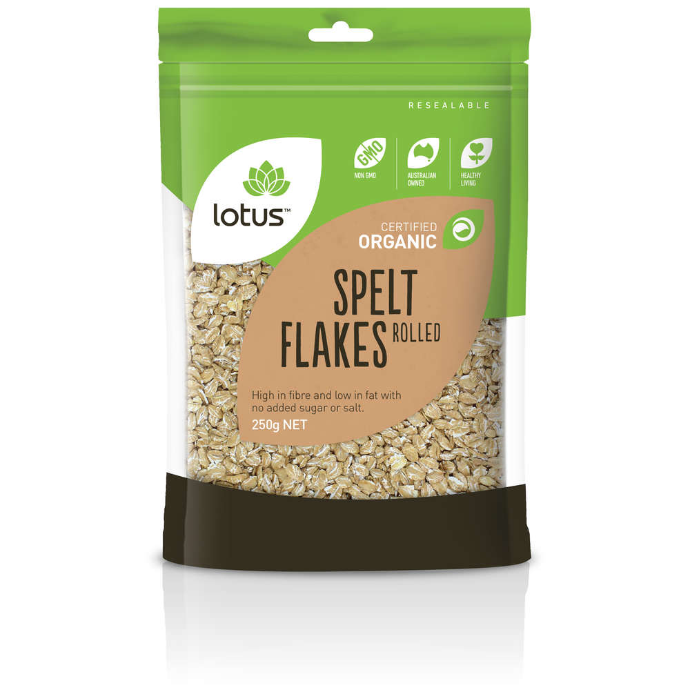 - Lotus Organic Rolled Spelt Flakes are sourced from the Netherlands and packed in Australia. They come in a 250gm re-sealable oxygen barrier bag to preserve freshness.