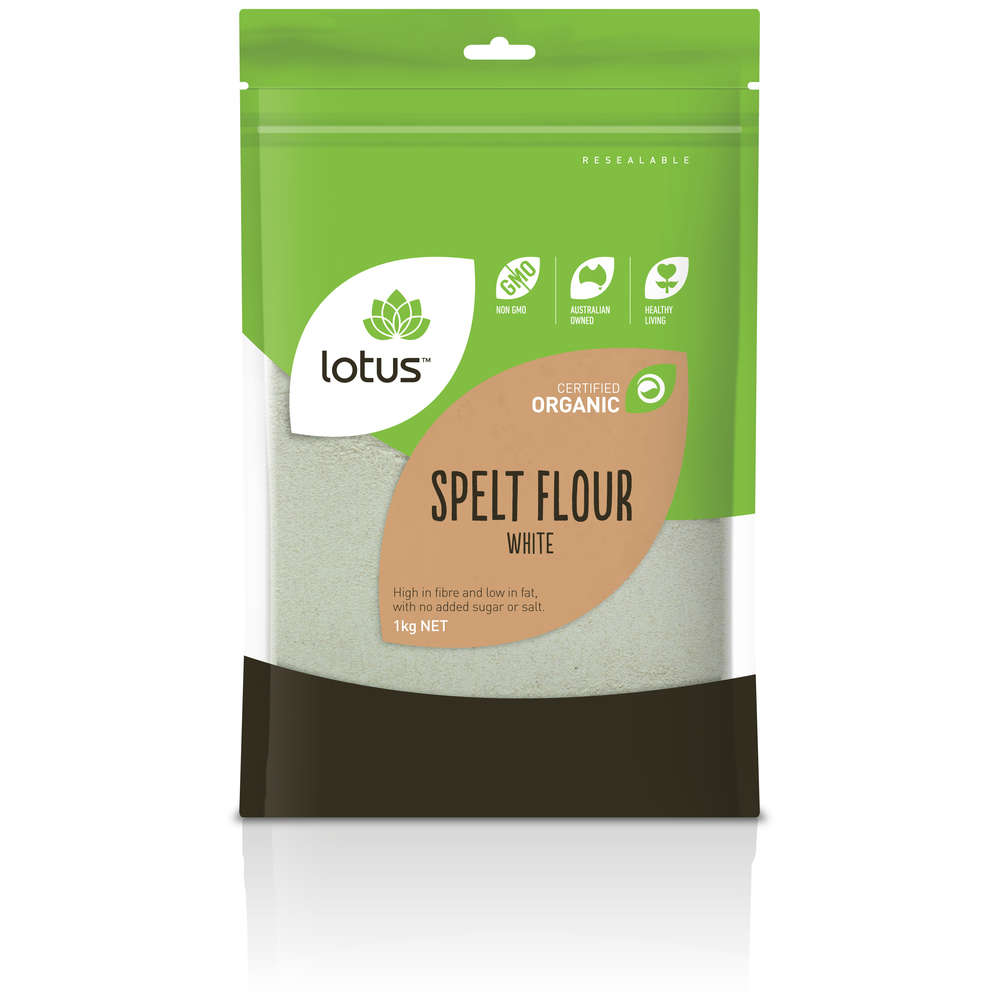 - Lotus Organic White Spelt Flour is packed in Australia using local ingredients. It comes in a 1kg re-sealable oxygen barrier bag to preserve freshness.