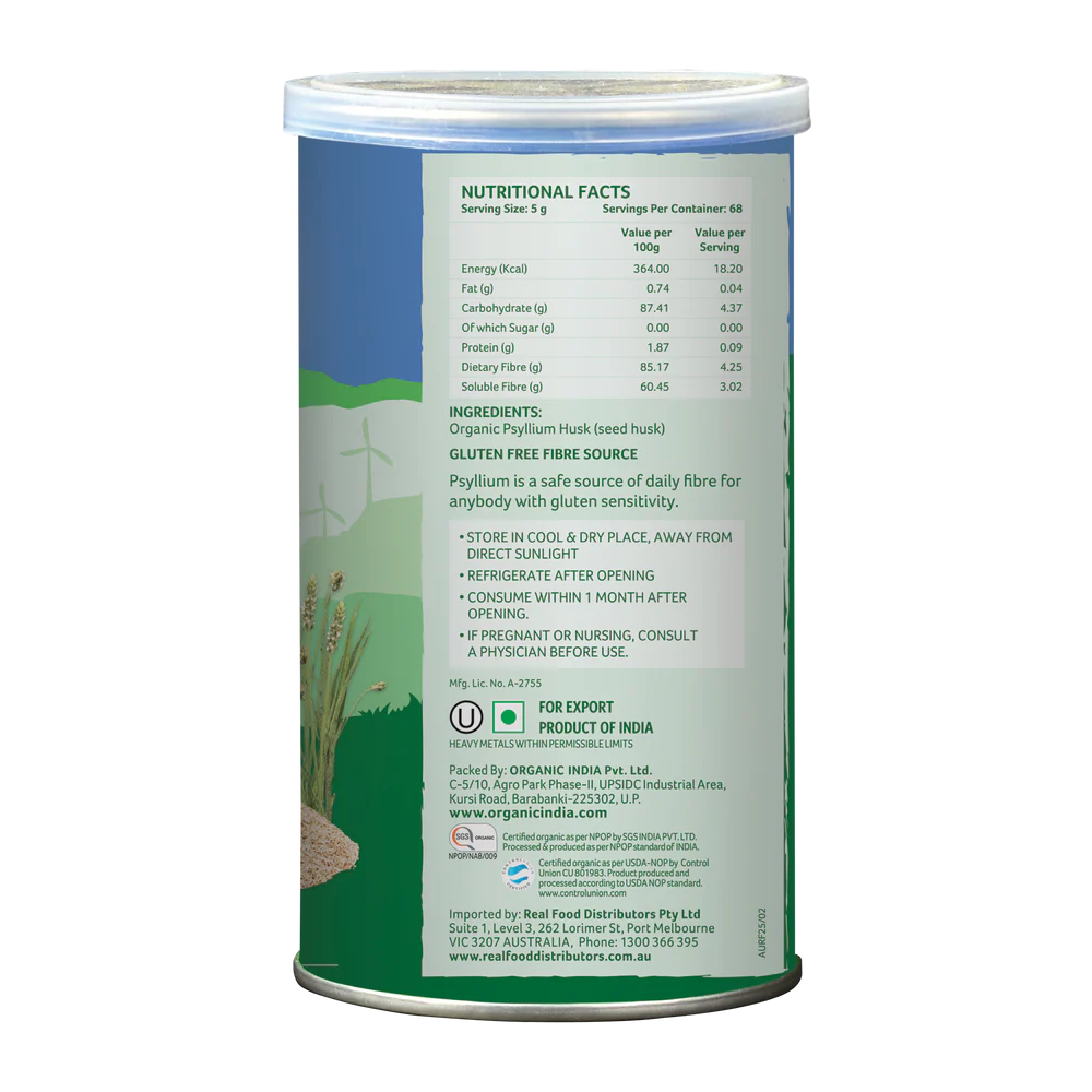 ORGANIC INDIA Certified Organic Psyllium Whole Husk is considered a gentle, bulk-forming supplement that contains both soluble and insoluble fibre which absorbs liquid in the intestines, to provide digestive support, aids in healthy elimination and regularity. Psyllium is a natural prebiotic, which promotes growth of beneficial microorganisms and supports gut health.