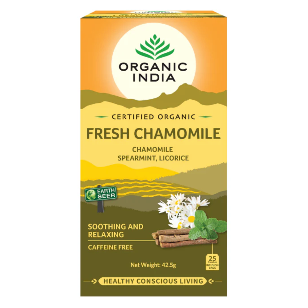 Drift into tranquillity with ORGANIC INDIA Fresh Chamomile. This certified organic infusion presents the fragrant aroma, earthy flavour and subtle sweetness of chamomile alongside the spicy freshness of spearmint and tastiness of licorice. Welcome the peace and relaxation that comes with every sip as you unwind at the end of a busy day.