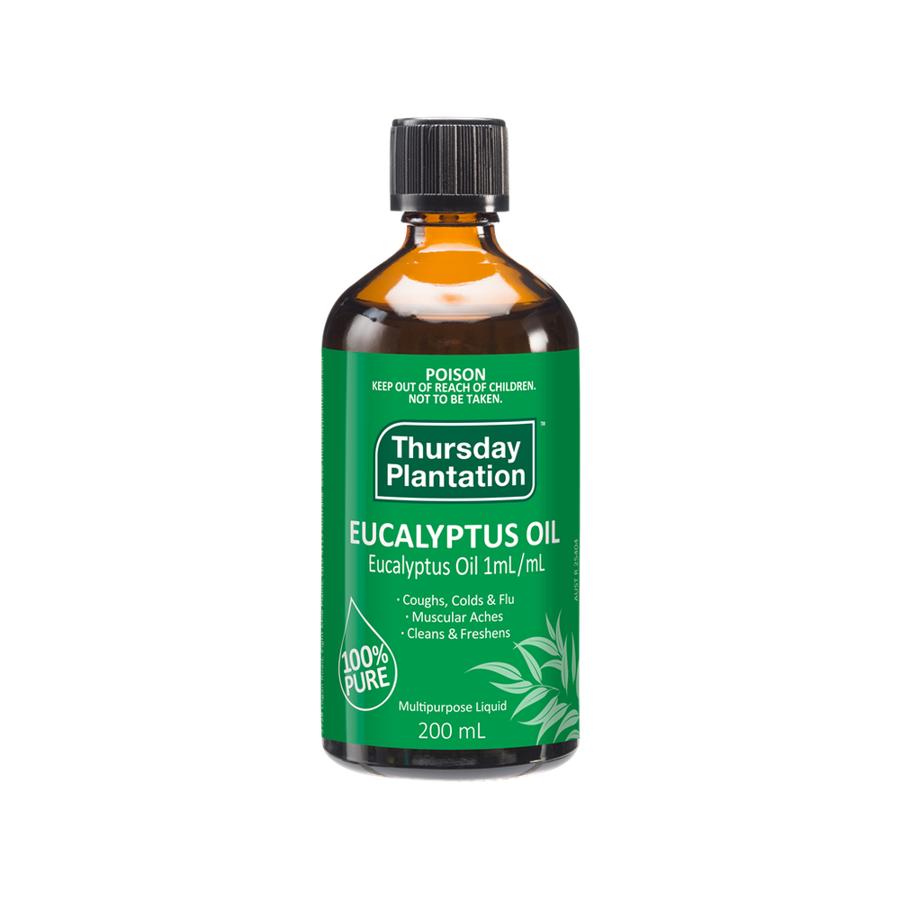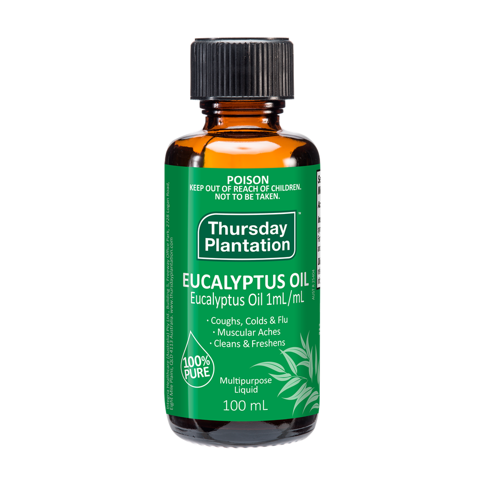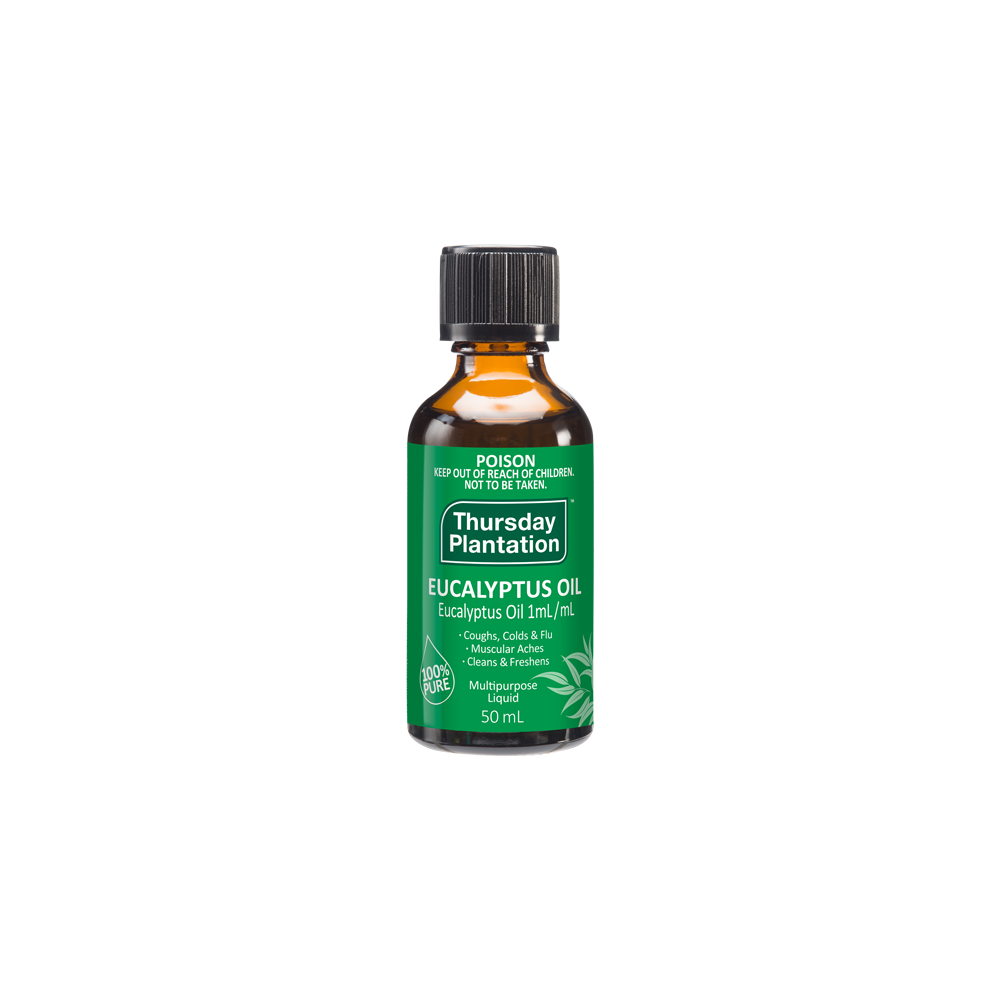 Thursday Plantation’s Eucalyptus Oil, contains 100% pure Eucalyptus Globulus oil with a high percentage of the Eucalyptol compound which is responsible for the oil’s clean, sharp, slightly medicinal smell as well as its medicinal value.
